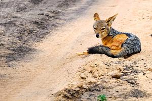 A jackal sits in the middle of the road near Tarangire National Park in Tanzania.