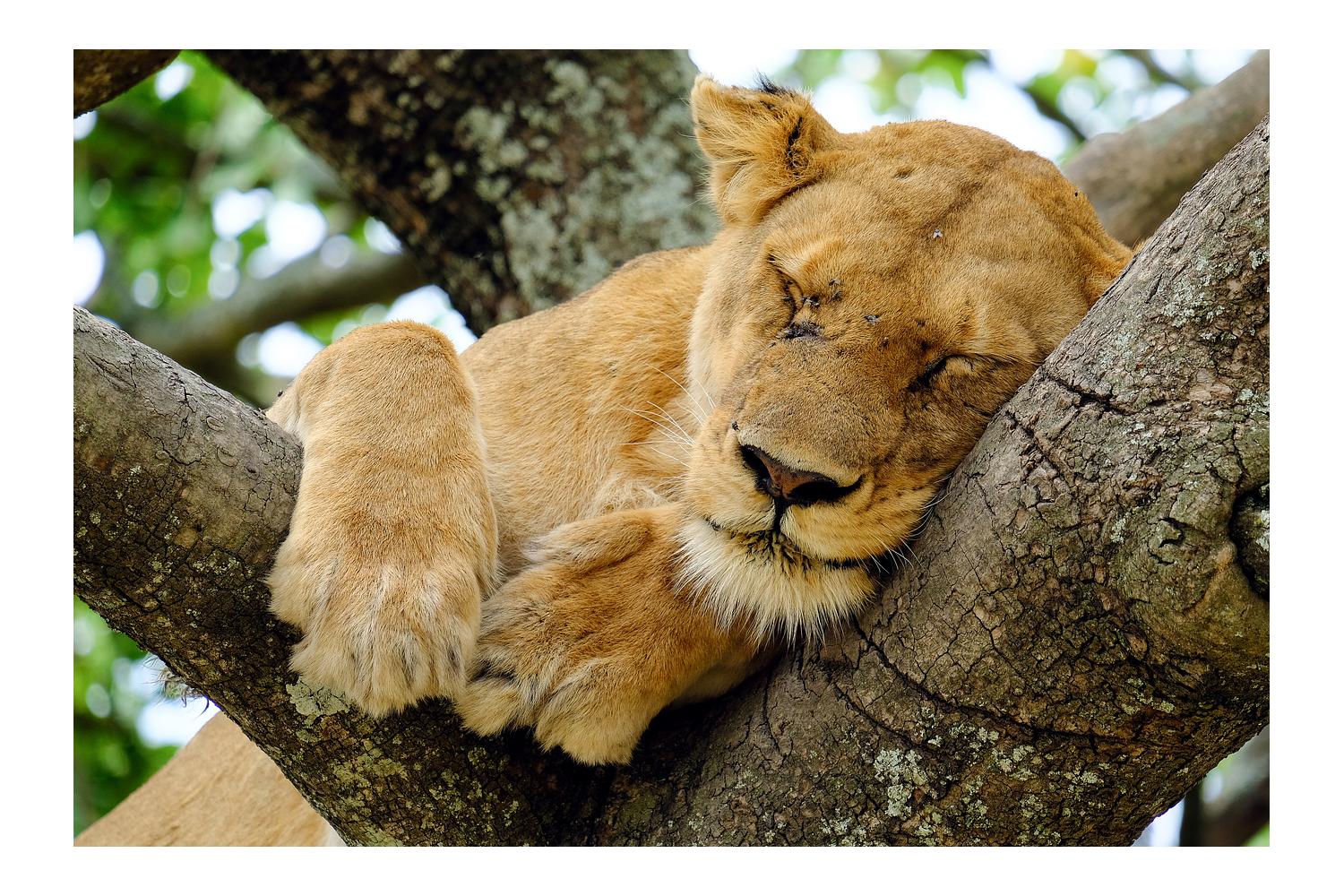 A lion sleeps in a tree midday in the Serengeti.