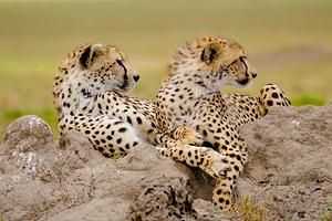 Cheetah brothers lounge on top of an termite hill in the Seregneti